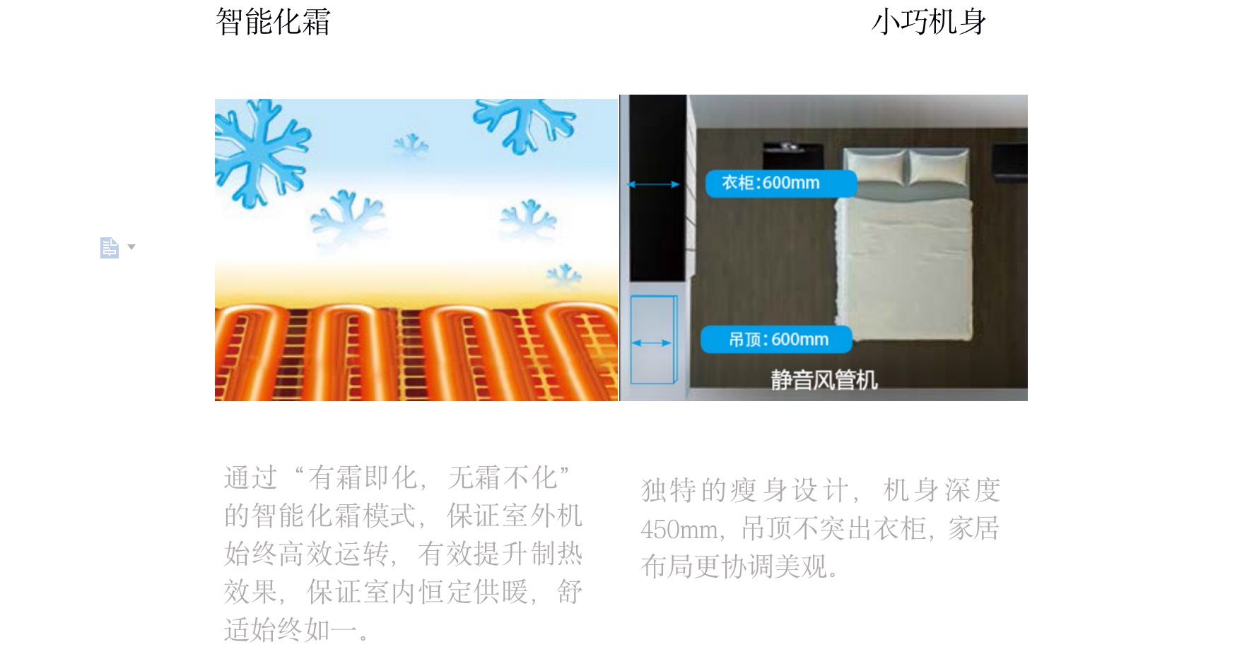 采用“V”型換熱器,開機初期,根據室內溫度與設定溫度自動調節至高頻狀態,縮短制冷或制熱時間,提升舒適度